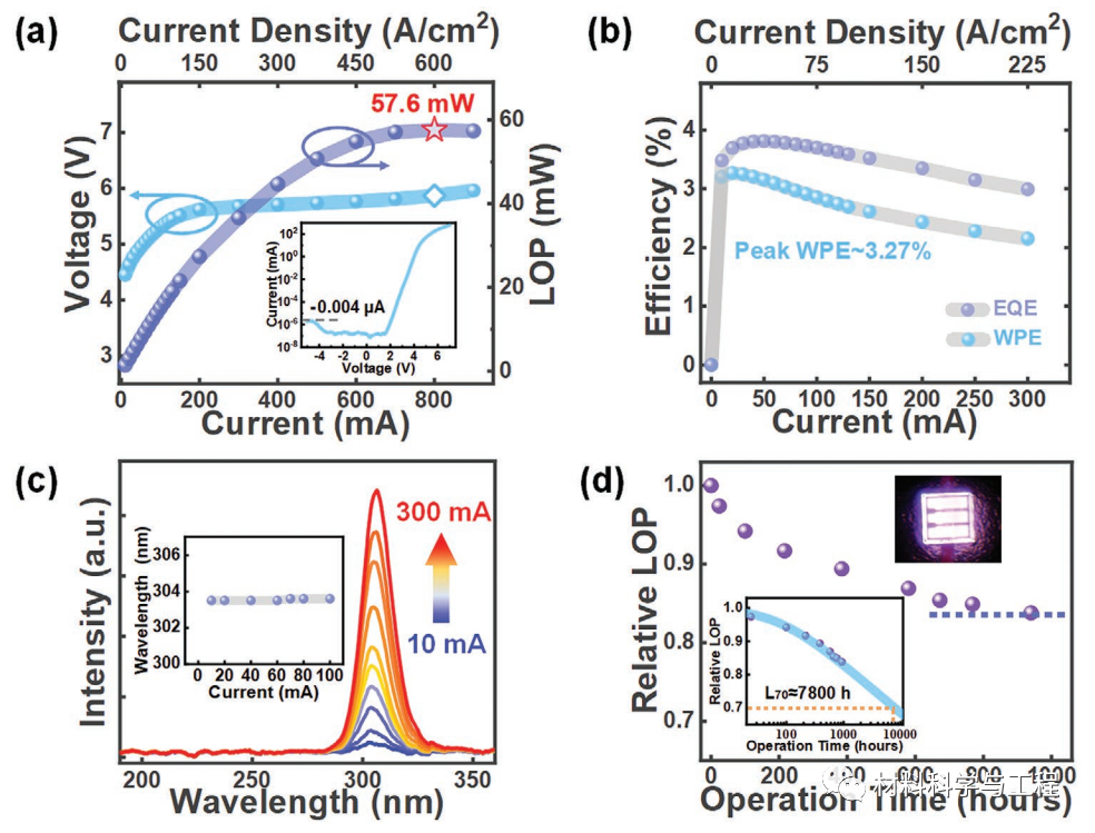 公司研发团队提出了一种衬底主导的应变调制策略。通过将纳米图案蓝宝石衬底(NPSS)上生长的AlN中的应变精确地操纵到略微拉伸的应变,成功抑制了MQW中的压缩应变,实现了峰值波长为 303.6 nm 的出色 UVB-LED。20 × 20 mil2 UVB-LED 芯片在 20 mA 正向电流下表现出 3.27% 的电光转换效率 (WPE),在 800 mA 的正向电流下,在 5.87 V 的极低电压下,具有 57.2 mW 的高 LOP。在75 A cm−2的正向电流密度下,运行1000 h后LOP降解率低至17%,表现出优异的稳定性。开发的UVB-LED具有高LOP和出色的可靠性,将有力促进基于AlGaN的UVB-LED的应用。